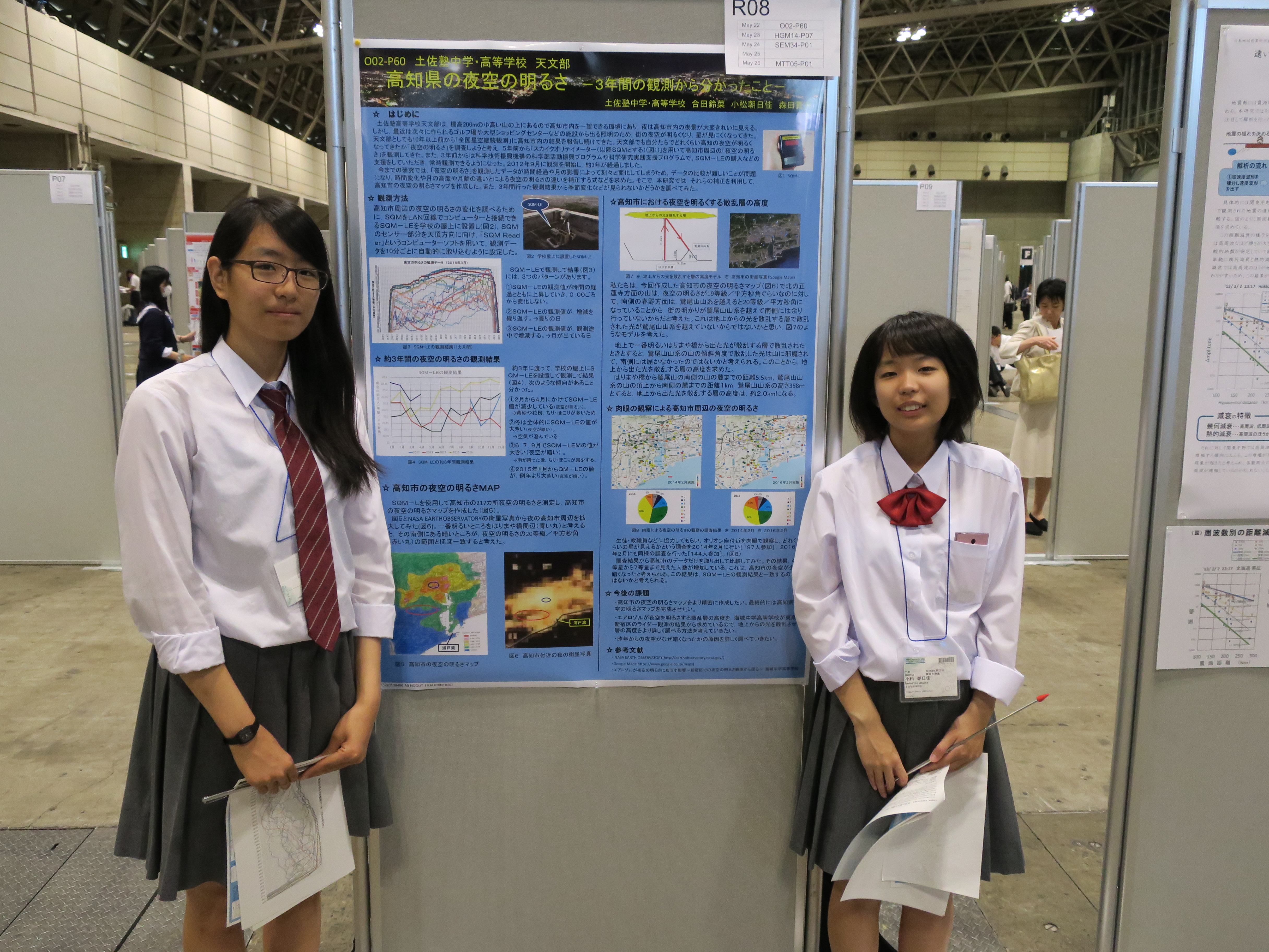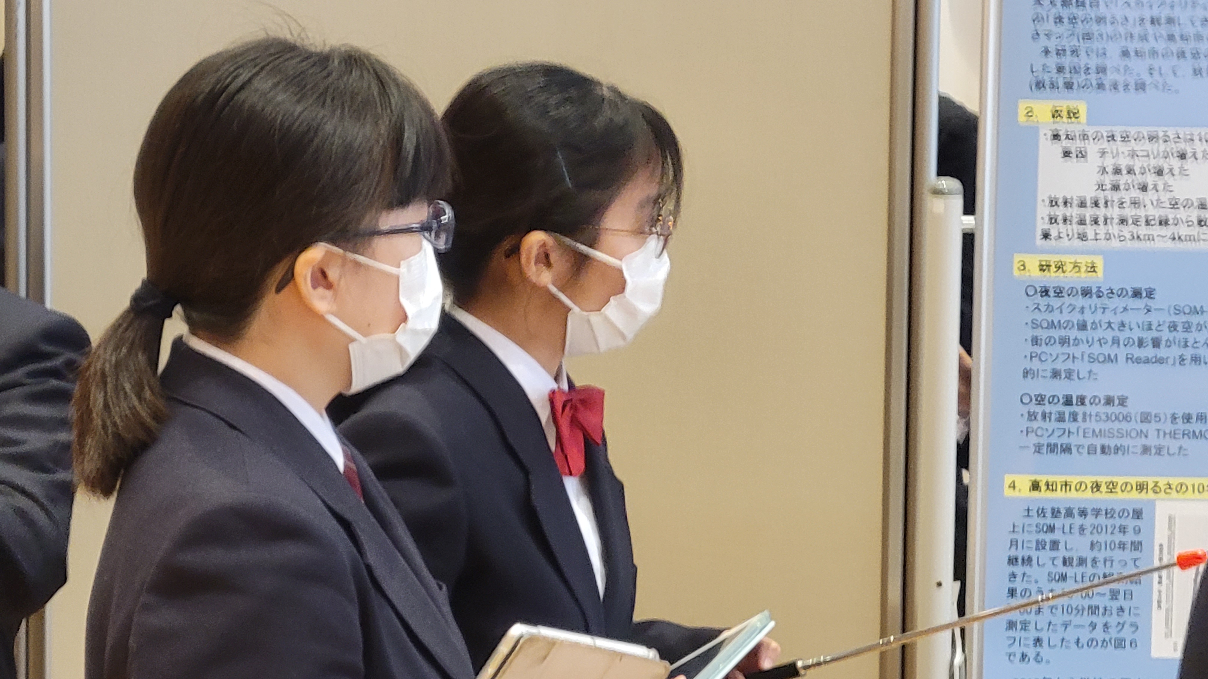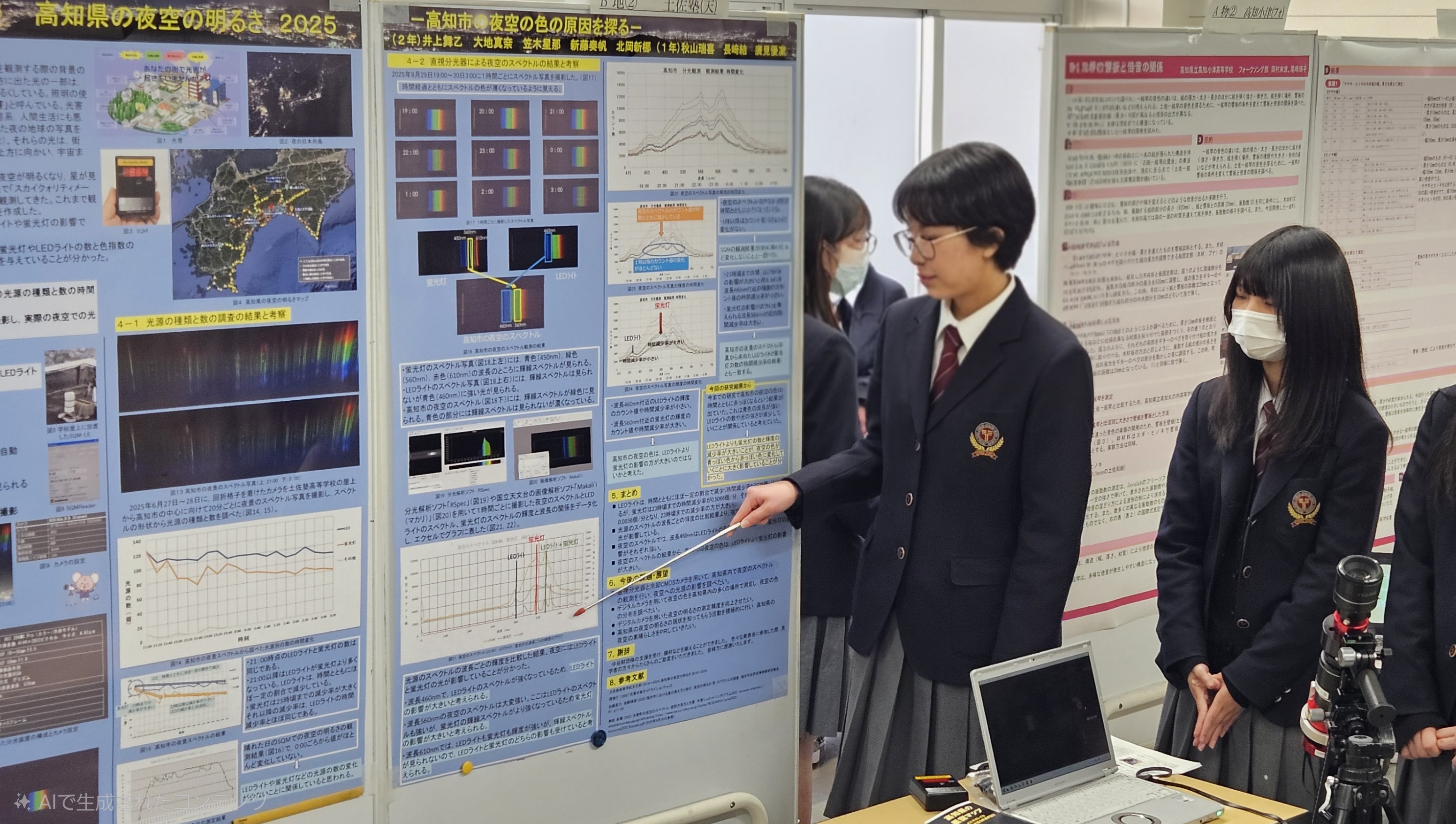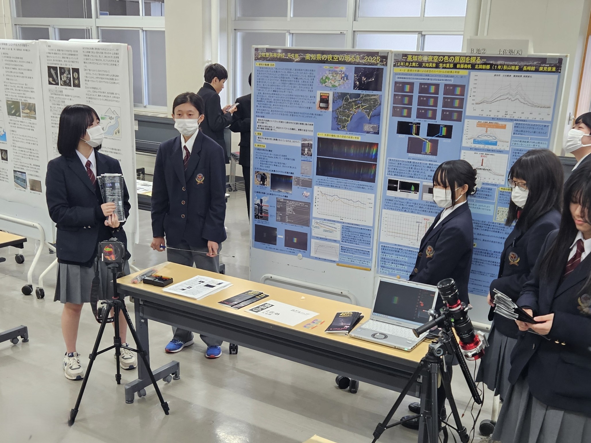 天文部は「高知県の夜空の明るさ―高知県の夜空の色は何色?」という研究テーマで研究発表を行いました。この研究では、デジタルカメラを用いて高知市の夜空の明るさや色を測定・分析し、時間帯によって夜空の色が変化することや、LEDや蛍光灯といった光源の種類による影響を明らかにしました。12年間にわたり継続してきたデータに新たな視点を加えたこの発表は、残念ながら入賞には至りませんでしたが、多くの来場者の関心を集め、活発な質疑が交わされました。
