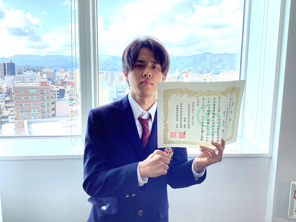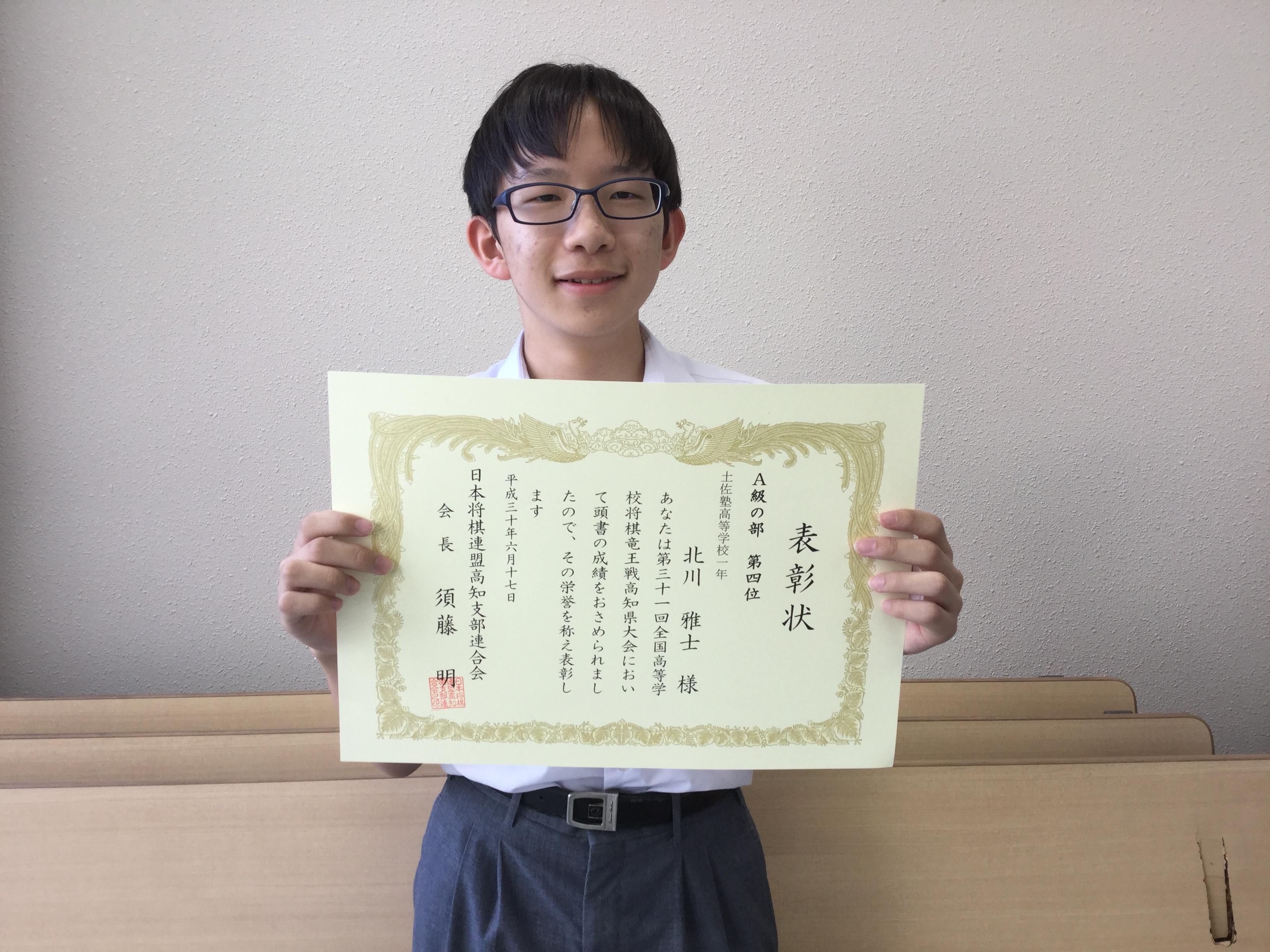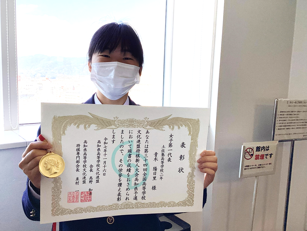 11月16日(日)、 高知市文化プラザ かるぽーと にて「第34回全国高等学校文化連盟 将棋新人大会高知県予選」が行われ、 本校将棋部員の青木陽日里さんが女子の部1位、前川竜汰さんが男子の部4位に入賞。これにより、青木さん・前川さんの両名は 令和7年12月13日(土)~14日(日) に愛媛県で行われる「 第22回四国地区高等学校文化連盟将棋選手権大会」に出場、また青木さんは 令和8年1月29日 (木)~1月31日(土)に山形県で行われる「 第34回全国高等学校文化連盟 将棋新人大会」に出場します。今後とも応援よろしくお願いします。