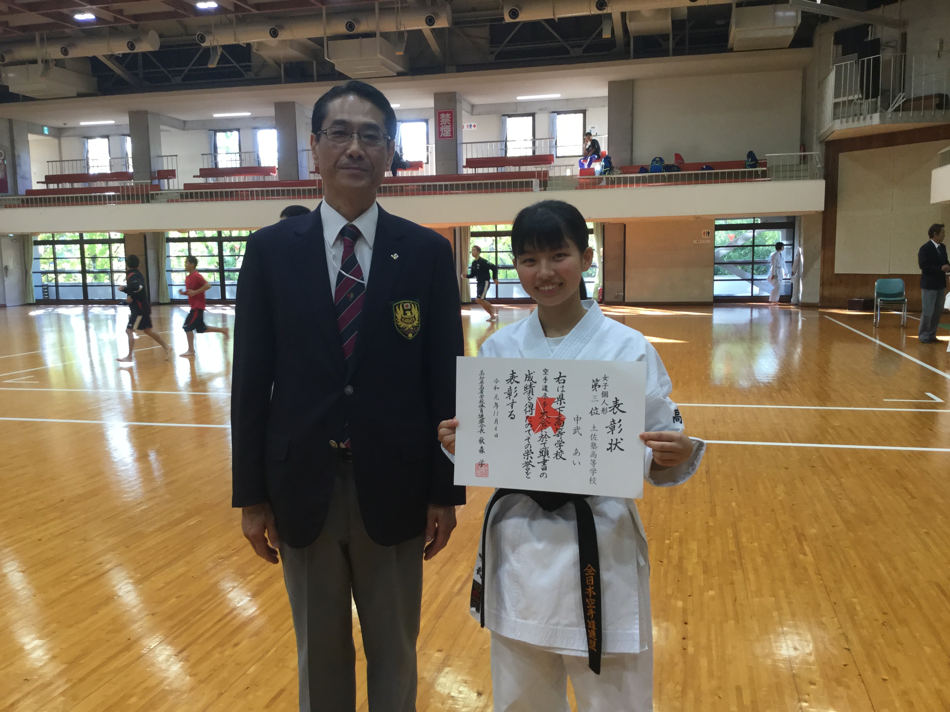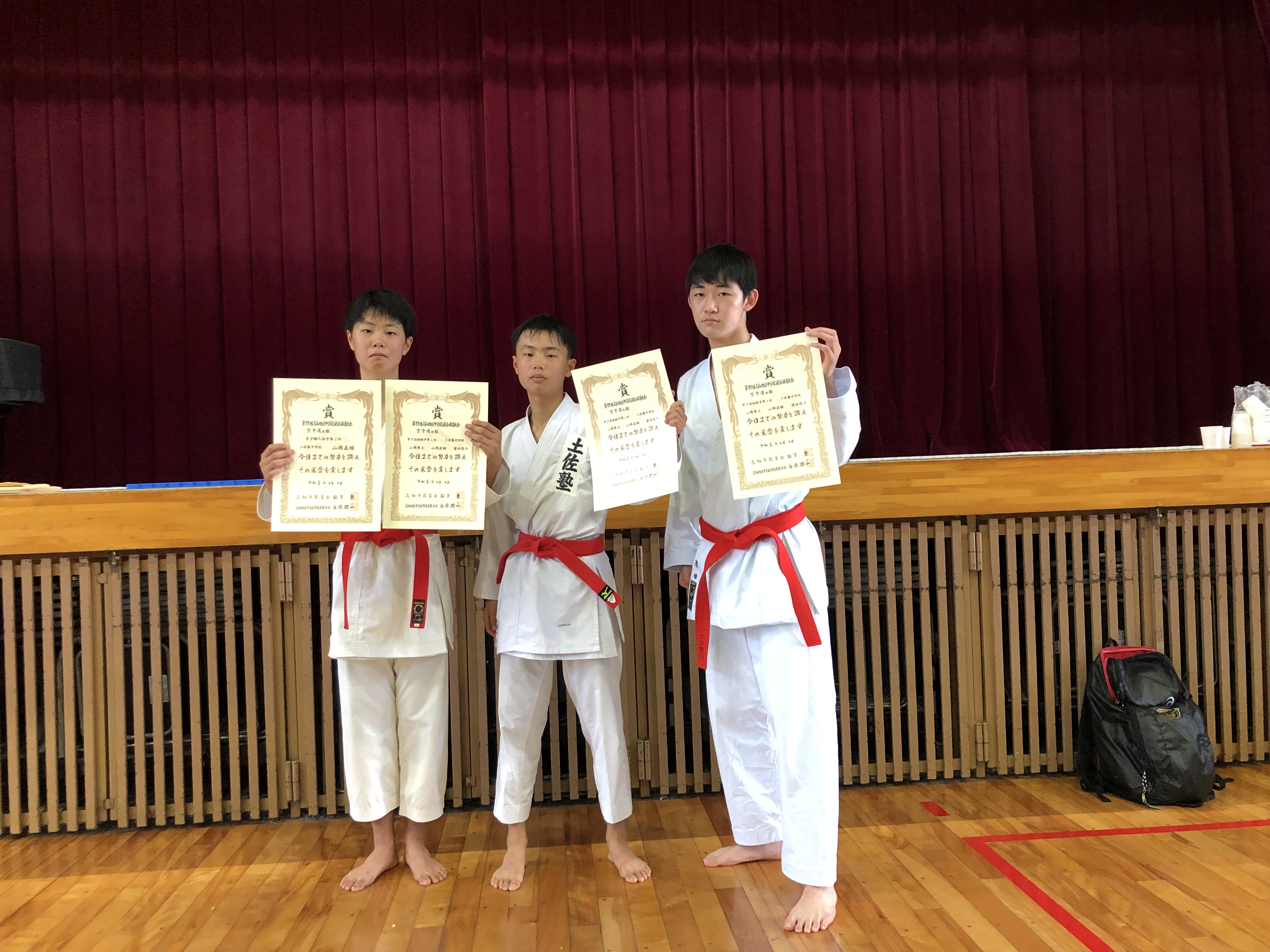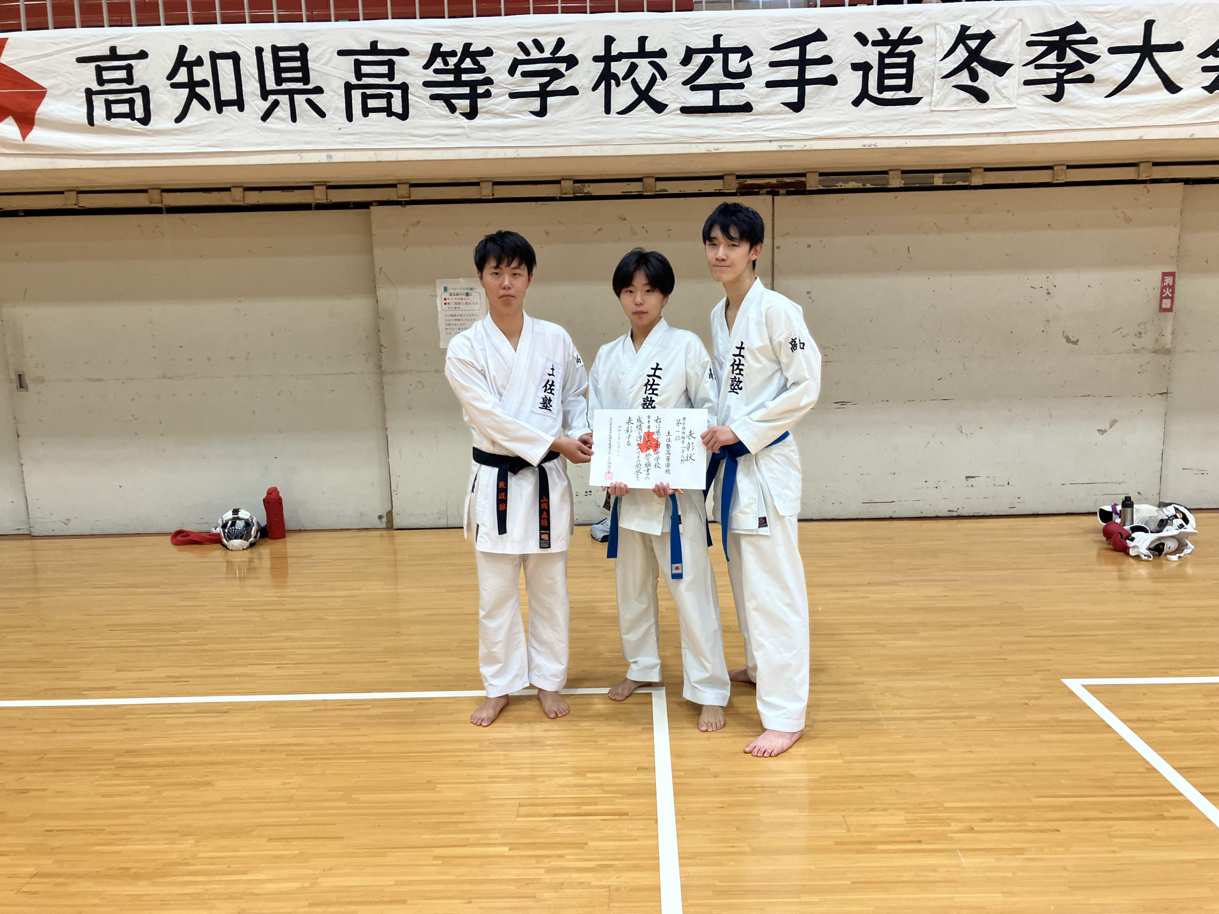 高知県高等学校空手道冬季大会(11/3武道館)において、3人制男子団体組手(2年山岡直睦、浜田悠斗、小松磨拓)で優勝しました。女子個人形(2年澤村咲嬉)とともに四国大会(12/20~21くろしおアリーナ)に出場します。応援よろしくお願いします。