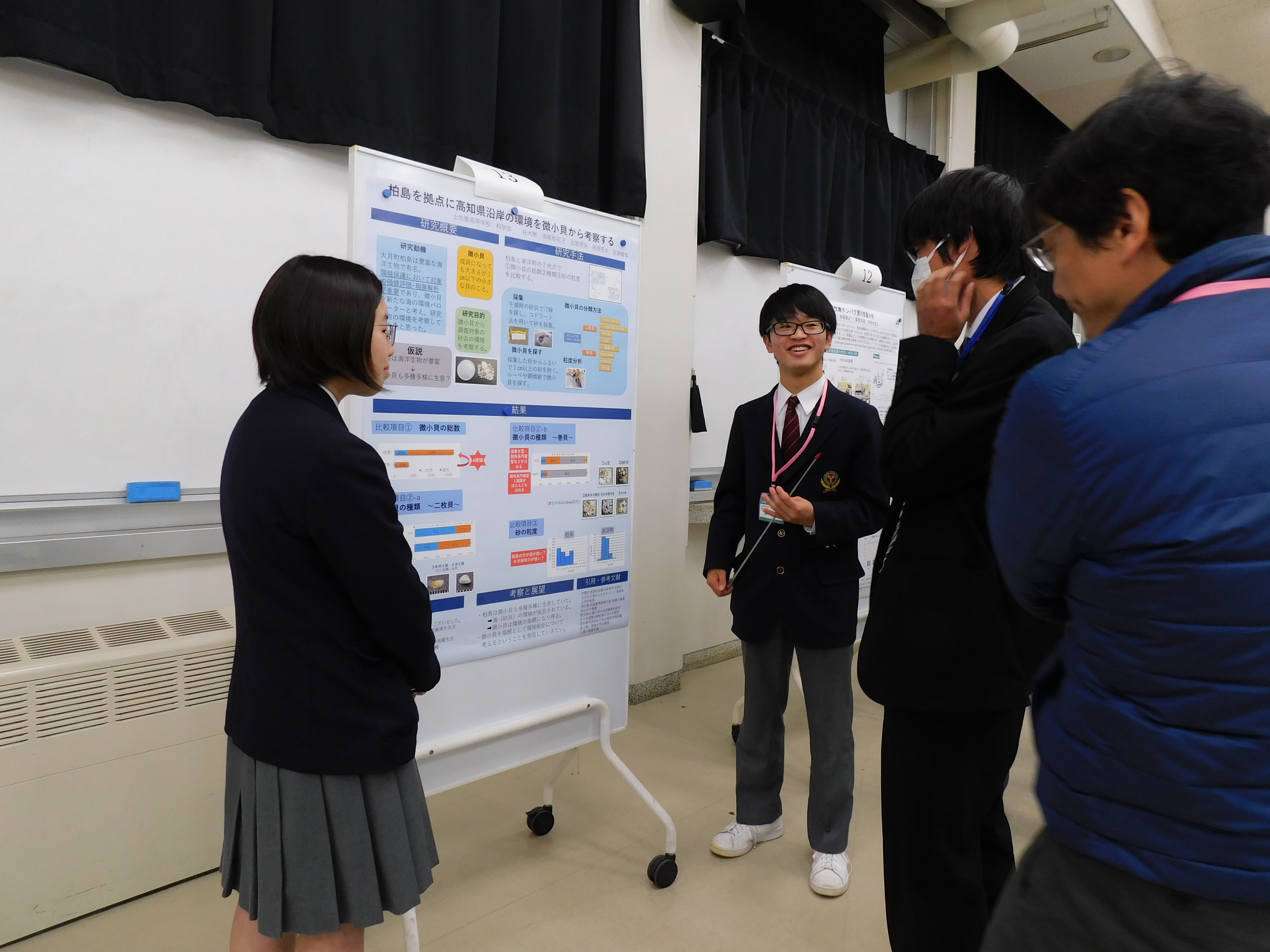 ポスター形式の発表では見学者との距離が近く少し緊張した様子も見られましたが、生徒たちは工夫しながら分かりやすい説明を行いました。他校の生徒の皆さんや大学の先生方から多くのご意見やご助言をいただき、大変有意義な学びの機会となりました。