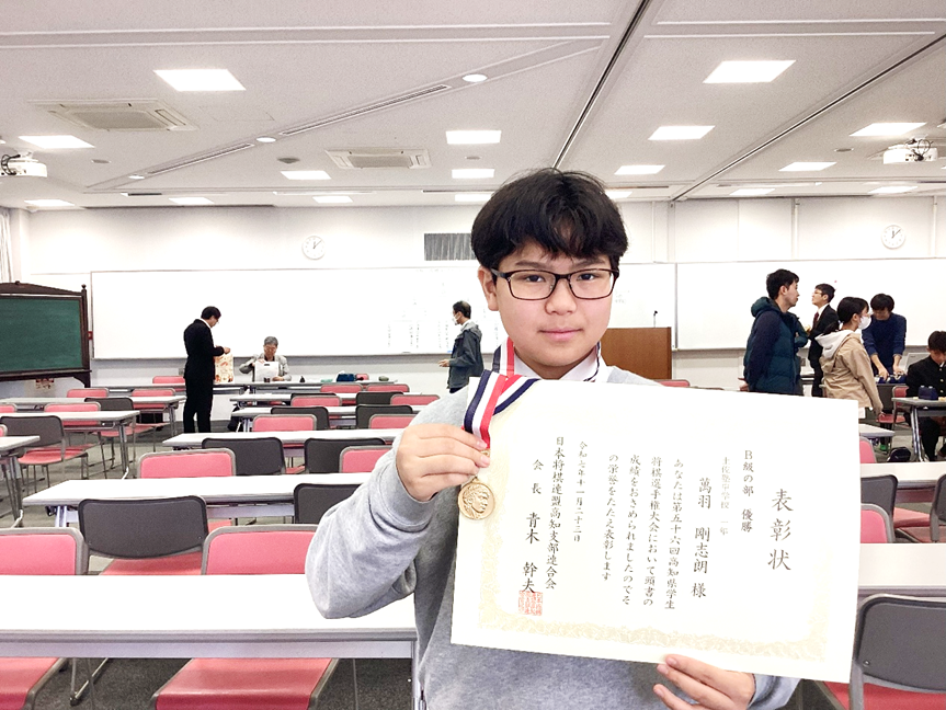 11月23日(日)に開催された「第56回高知県学生将棋選手権」B級(中学生以下の部)にて本校将棋部の萬羽剛志朗さんが優勝、池澤伯さんが決勝トーナメント進出(ベスト8)と活躍。また、同A級(高校生以上および希望者の部)に4名が挑戦し、中島奈津さんと前川竜汰さんの2名が決勝トーナメント進出を果たしました。今後とも応援よろしくお願いいたします。